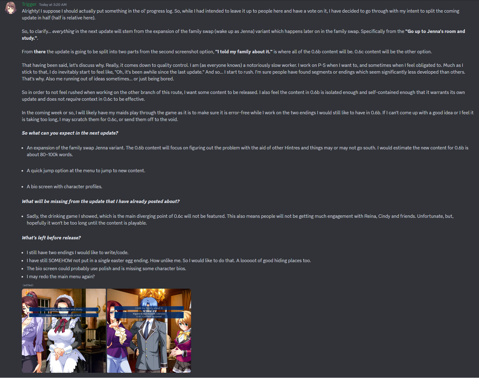 - An expansion of the family swap Jenna variant. The 0.6b content will focus on figuring out the problem with the aid of other [Hintre’s] and things may or may not go south. I would estimate the new content for 0.6b is about 80~100k words.