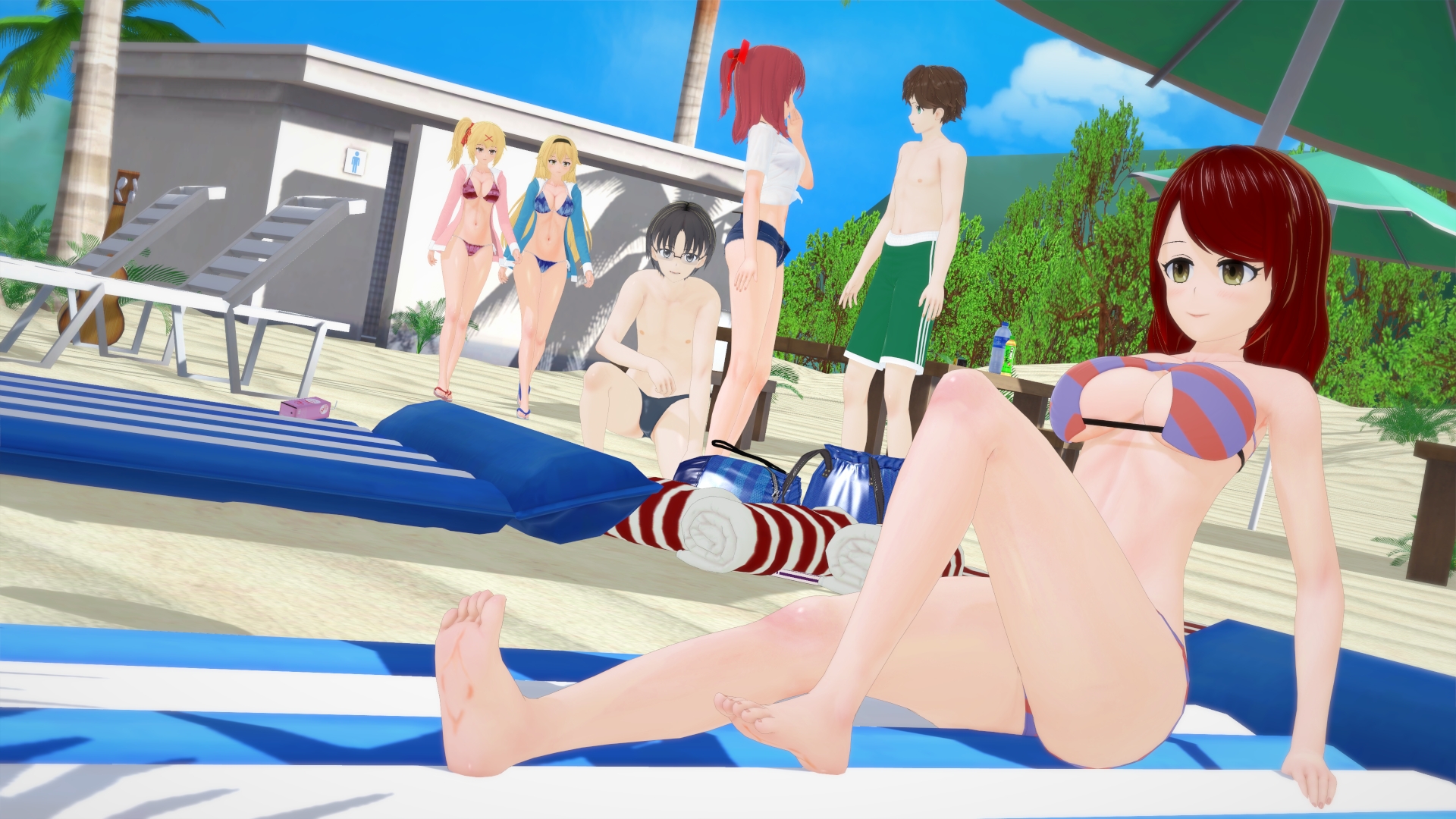 Tangent aside, Miho(Yusei) seems to understand what Yusei was getting up to in her body, yet before he can face her ire, Risa suggests they do an exchange. Thereby granting Yusei the privilege of being a curvaceous beach MILF, while Risa is free to frolic with the rest of the teens. They have their fun, and curiously head to a… hotel? It’s a series of six rooms that are basically all windowless bedrooms, and the hallway looks over a road that appears to go under the building they are currently in. Not a hotel, not a home, probably just a kitbashed setting from Koikatsu’s limited locales.