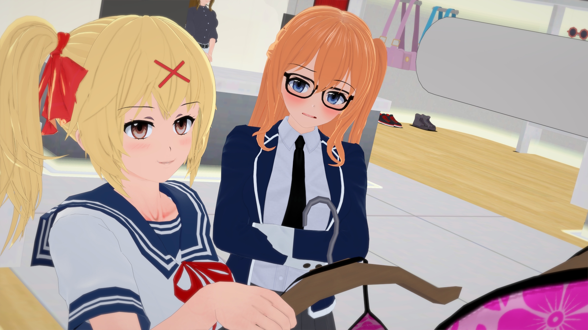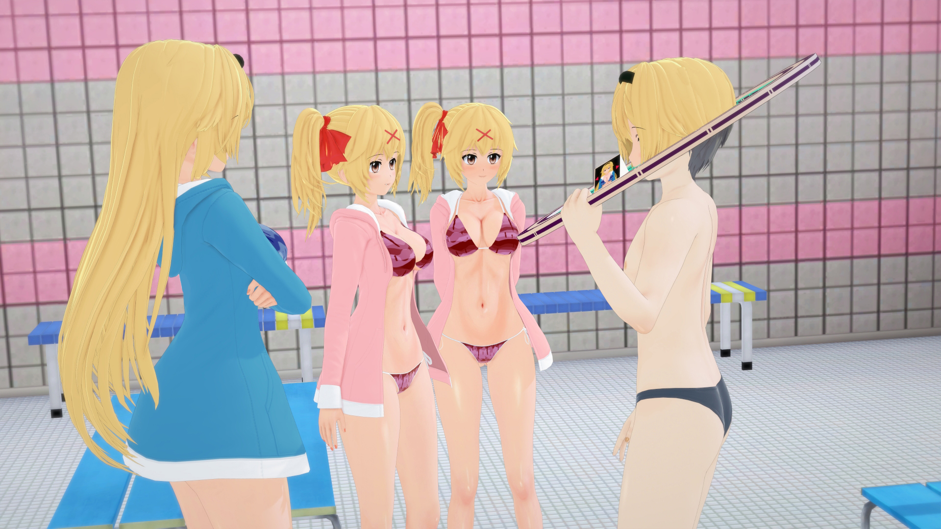 Regardless, the two head to the school pool for PE class, which is where I need to comment on the artwork. Koikatsu is a kitbashed wack job of a program, capable of performing miracles, while having wild quality disparities. A lot of these are texture-based, and make the software look like a weirdly optimized PS Vita game. I can overlook most things, but the water? That’s not even comparable to any gaming generation, it’s just bad to look at. At best, it looks like blue Jell-O, at worst, it looks like a flat blue surface characters clip through.