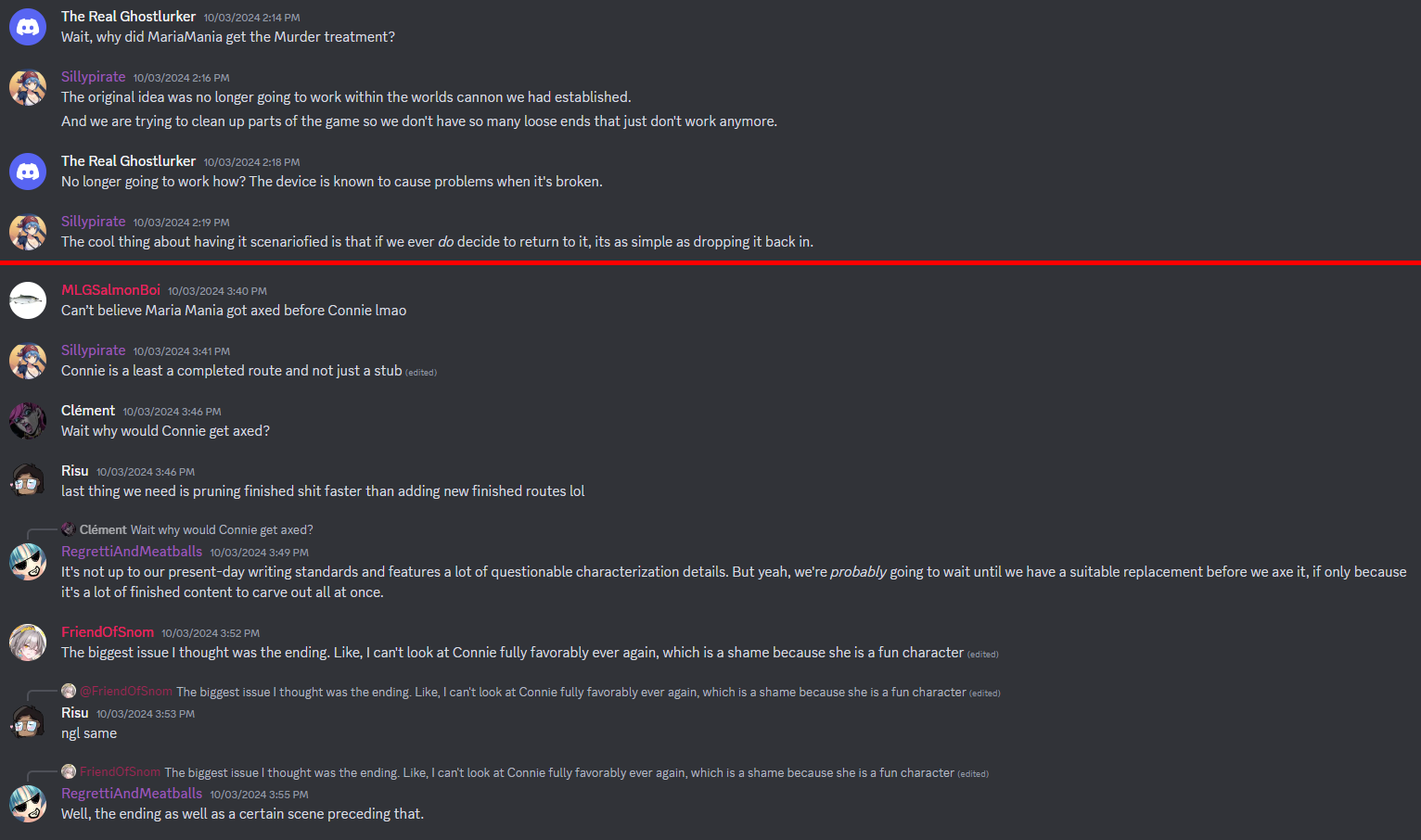 However, the dev team is not in a rush to cut the Connie route, with Regretti saying that they are “probably going to wait until [they] have a suitable replacement before we [they] it.” Which is better than just cutting it. …But part of me thinks that the dev team is just waiting until CaptainCaption dies so they can remove the route, like, a month later and hope nobody notices. That’s what I would do if I were a petty bitch.