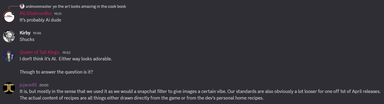 But then I sent to search for who did the artwork, and found this conversation between jcjace and whether the artwork here was AI generated. He did not offer a direct answer, saying that they “used [AI] as we would a snapchat filter to give images a certain vibe.” Before making it sound like the recipes were the main draw of this, and where all the effort was spent. …Which to me indicates that they view the illustrations as the supplemental pieces, when I would consider it to be the main draw. Goldarn it ST dev team. It is one thing to make something that is blatantly AI with that Rhythm Transfer game last year, but don’t hide AI artwork in a damn cookbook, especially when it looks pretty legitimate due to the sketchy, colored pencil filter applied to the artwork, which does wonders to hide the AI imperfections. Generate AI images once for a joke, I roll my eyes at you. Generate AI images for something you actually expect people to use, and obscure that fact, then I don’t want to be in the same room as you, ya poopy-stank-bitches.