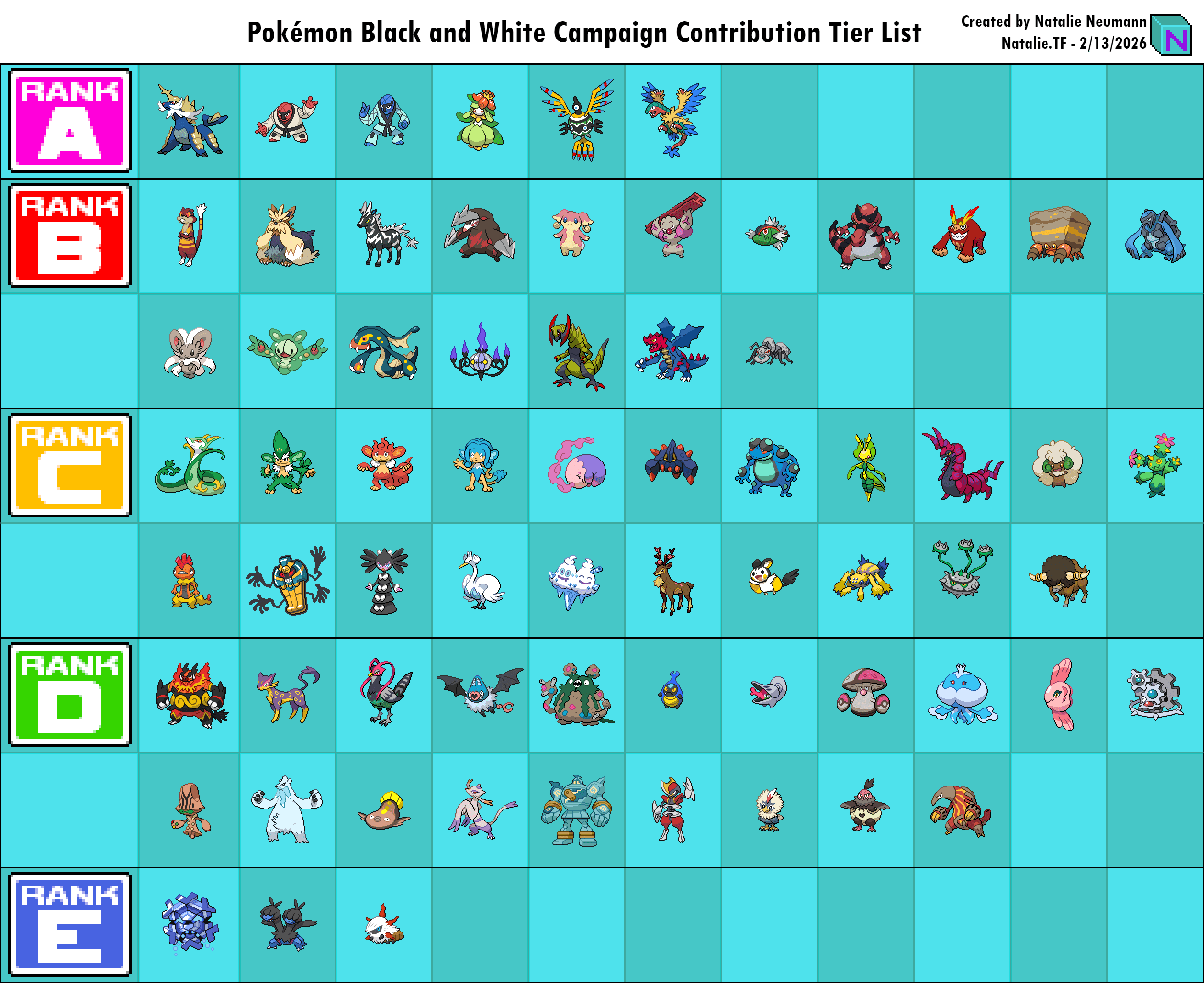 I’m tempted to give it a B Rank as it is not an excellent Pokémon, but it does not have much competition given the scarcity of other Unova Water types.