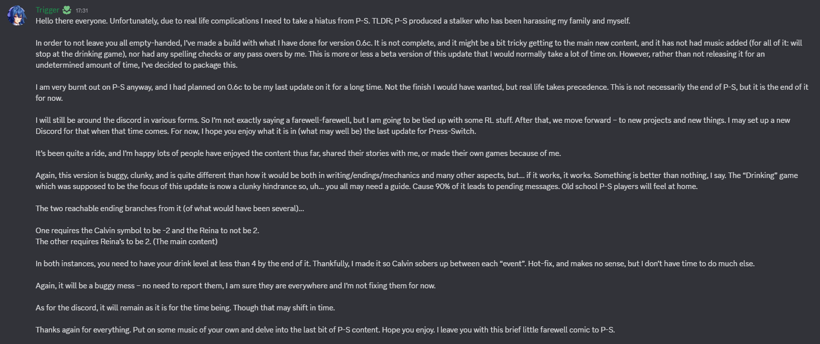 On May 12, 2025, Trigger delisted Press-Switch’s TFGamesSite page, and privated the official Discord server, due to the continued harassment of a stalker. Later, on May 29, 2025, Trigger announced that the development of Press-Switch would go on a hiatus effective immediately, attributing his decision to the stalker along with his own creative burnout. This announcement was paired with the release of an incomplete beta of the in-development Version 0.6c, which has numerous bugs and dead ends. You can view my contemporaneous thoughts on this news in Rundown (6/01/2025).